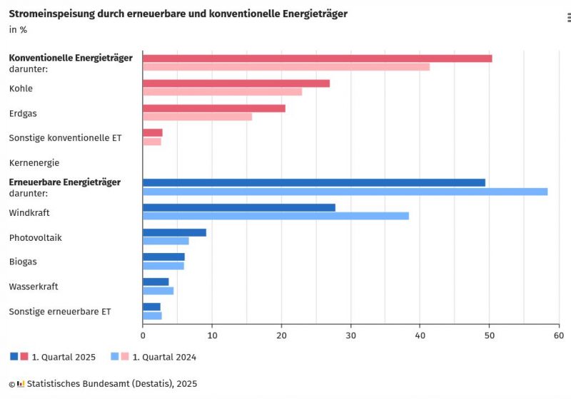 WIESBADEN – Im 1. Quartal 2025 wurden in Deutschland 119,4 Milliarden Kilowattstunden Strom produziert und in das Stromnetz eingespeist. Wie das Statistische Bundesamt (Destatis) nach vorläufigen Ergebnissen mitteilt, waren das 1,9 % weniger Strom als im 1. Quartal 2024 (121,7 Milliarden Kilowattstunden). Etwas mehr als die Hälfte des inländisch erzeugten Stroms (50,5 %) stammte aus konventionellen Energieträgern. Insgesamt stieg die Stromerzeugung aus diesen fossilen Quellen gegenüber dem Vorjahresquartal um 19,3 % auf 60,2 Milliarden Kilowattstunden. Im 1. Quartal 2024 hatte der Anteil der Stromerzeugung aus fossilen Quellen noch bei 41,5 % gelegen. Demgegenüber sank die Stromerzeugung aus erneuerbaren Energiequellen im 1. Quartal 2025 im Vergleich zum Vorjahresquartal um 17,0 % auf 59,1 Milliarden Kilowattstunden und einen Anteil von 49,5 % an der gesamten inländischen Stromproduktion (1. Quartal 2024: 58,5 %). Damit war die Stromerzeugung aus konventionellen Energieträgern im 1. Quartal 2025 erstmals seit dem 1. Quartal 2023 höher als die Stromerzeugung aus erneuerbaren Energien.