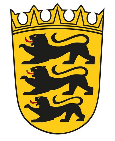 Herzogtum Schwaben und bestimmten von hier aus die Geschichte des Deutschen Königreiches. Im goldenen Schild des Großen Landeswappens lebt das Wappen des staufischen Herzogtums Schwaben fort. Es zeigt drei schreitende schwarze Löwen mit roten Zungen. Der goldene Schild wird von einem Hirsch und einem Fabeltier, dem Greif, gestützt. Der Hirsch ist das Wappentier Württembergs und der Greif das Wappentier Badens. Im Großen Landeswappen repräsentieren sie aber nicht nur die beiden größten Landesteile, sie sind außerdem die symbolischen Hüter und Wächter des Landes Baden-Württemberg und seiner Verfassung. Im Großen Landeswappen ruht auf dem Schild eine Krone mit sechs historischen Plaketten. Diese stehen für die zwischen dem Mittelalter und dem Ende des Alten Reiches wichtigsten südwestdeutschen Territorien. In der Mitte der Wappenkrone stehen erhöht die Stammwappen von Baden und Württemberg. Das badische Stammwappen, in Gold ein roter Schrägbalken, ist seit 1207 nachweisbar. Das württembergische Pendant, drei übereinander liegende schwarze Hirschstangen im goldenen Schild, seit 1228. Links in der Wappenkrone des Großen Landeswappens sind die silberroten Spitzen des 'Fränkischen Rechens' für das Herzogtum Ostfranken zu sehen, in dem sich staufische Hausmachtsgebiete befanden. Im heutigen Baden-Württemberg gehört die Region Heilbronn-Hohenlohe zu Ostfranken. Andere Teile liegen heute in Bayern (Raum Würzburg) und im Hennenberger Land im heutigen Thüringen. Bis nach dem zweiten Weltkrieg gehörte die Region um Sigmaringen zu Preußen. Daher